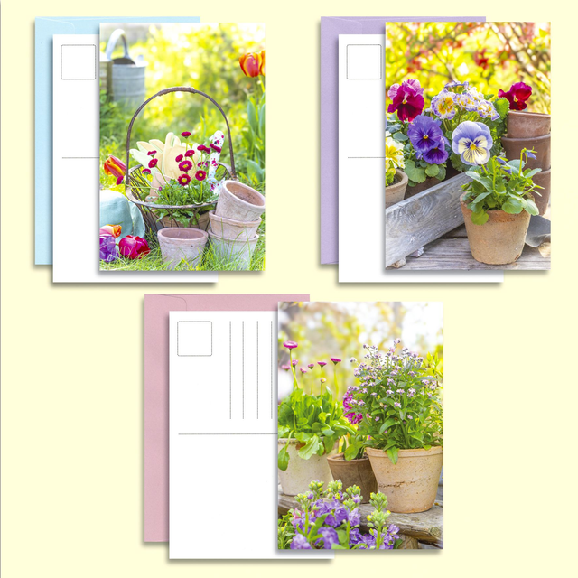 Lot de 3 cartes de correspondance 'Le temps des plantations' (3 visuels différents) format A6 (105 x 148 mm) + 3 enveloppes couleurs (coloris variables)